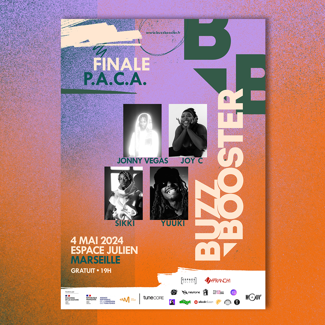 Ce 4 mai, venez découvrir sur scène les quatre artistes rap qui se sont démarqués parmi plus d’une centaine de candidats en PACA. Ces talents prometteurs ont convaincu le jury grâce à leur proposition artistique et leur potentiel scénique, et vont maintenant concourir pour une place à la finale nationale du Buzz Booster.
