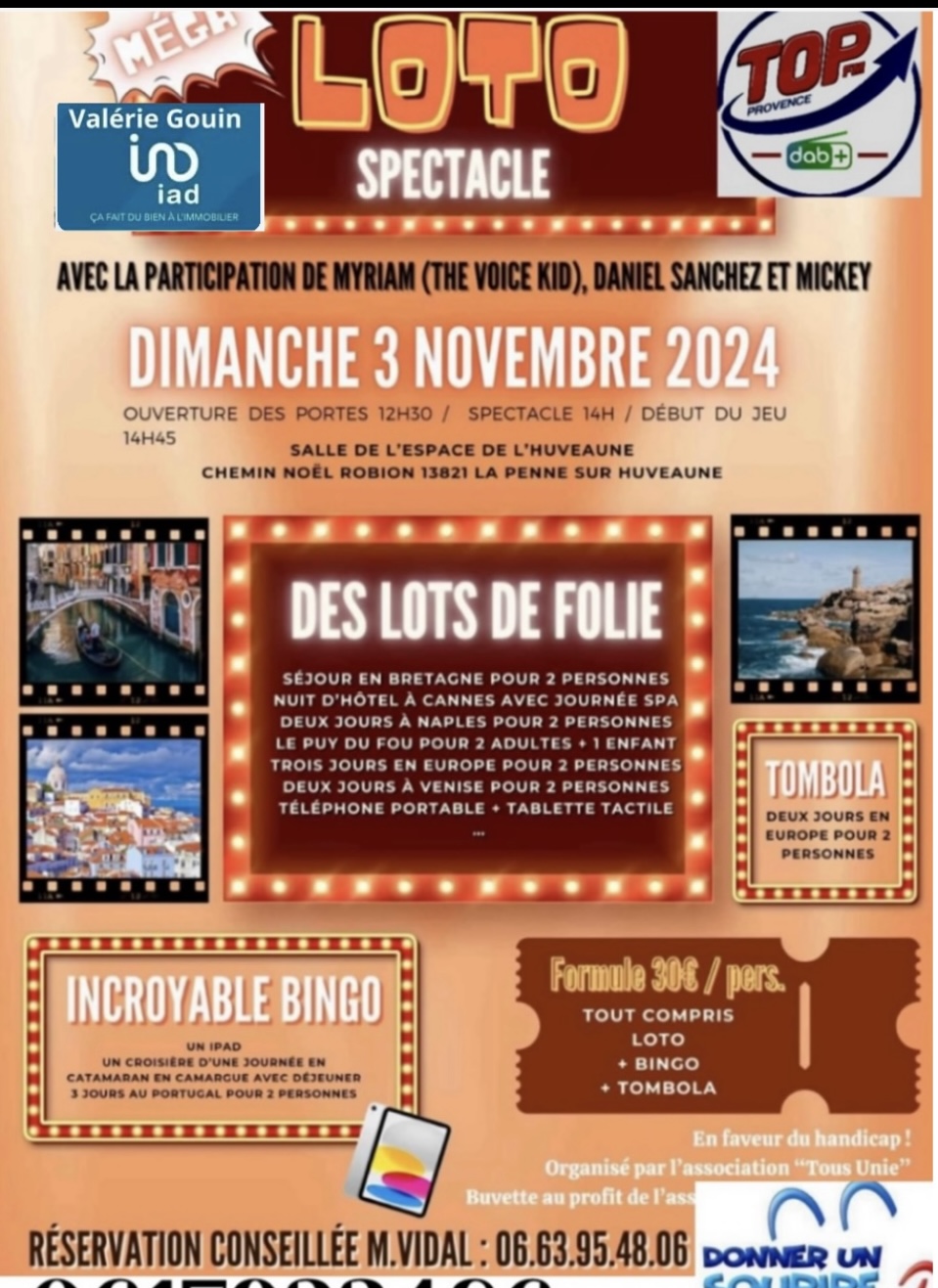 Grand loto spectacle avec Myriam the voice kids Daniel Sanchez Mickey et de nombreux lots de valeur : voyage iPad téléphone séjour voyage croisière en catamaran bon soin restaurant etc …