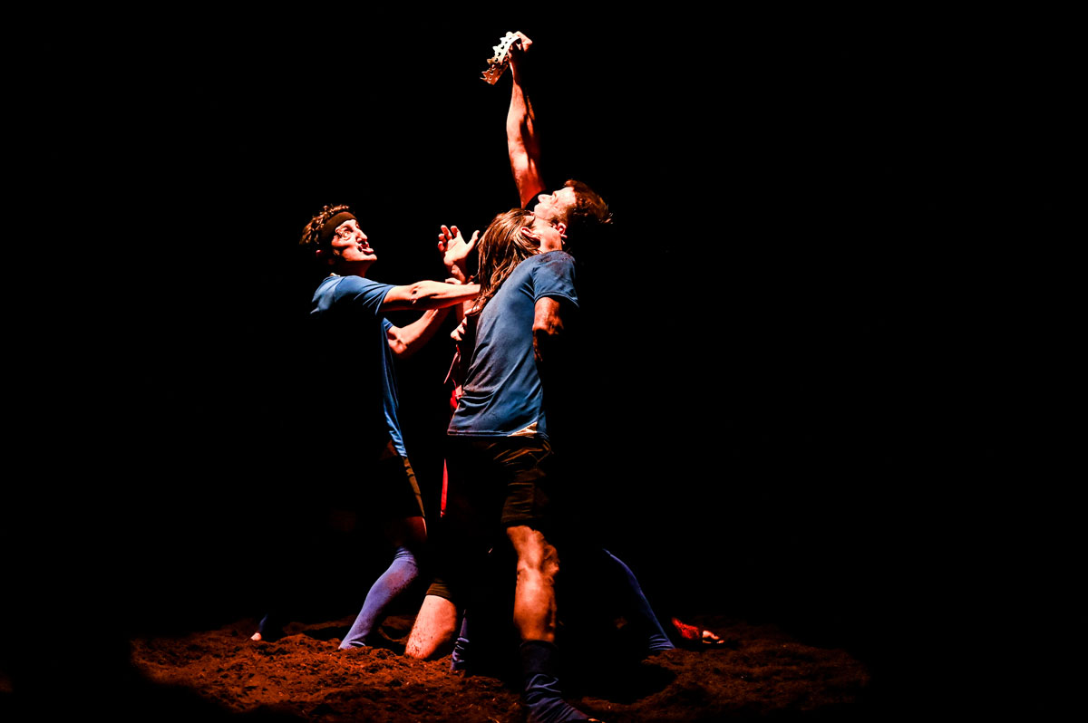 Le lieu du récit, le stade, l’espace scénique, la terre… le camp, le pays. Ici, au centre de l’arène, l’affrontement des joueurs est soutenu par la rudesse de la musique et le respect des règles est assuré par un arbitre douteux. Tout autour, des supporters galvanisés par leurs chants agitent leurs drapeaux, leurs bannières.