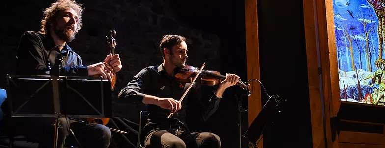 Cette bête qui échappe aux armées du Roi, qui est-elle ? Un monstre fantastique, un chien dressé, un complot des uns et des autres ? Pour tenter d’y voir plus clair, deux colporteurs d’aujourd’hui, armés de leurs instruments à cordes, de leur bagou et d’une série de peintures édifiantes, livrent leur version des faits. On s’y perd, on s’y retrouve, on frissonne et on rit. Dans leurs bagages, ils charrient aussi des musiques répétées, déformées, réinterprétées, aux côtés des mots, des émotions et du verbe qui fut au commencement. Entre leurs mains, elles reprennent vie au fil d’un récit universel et haut en couleur : celui des pays qui existent et de ceux qui n’existent pas..