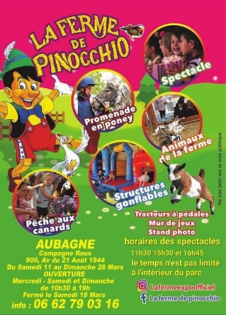 La ferme de Pinocchio est un parc d’attractions et de loisirs itinérante qui fait le tour de France. Rendez-vous en famille sur le PARLING CAMPAGNE ROUX à Aubagne. Les enfants y découvriront des animaux, pourront faire une balade à poney, s’amuser sur les structures gonflables, faire une course de tracteur à pédale…