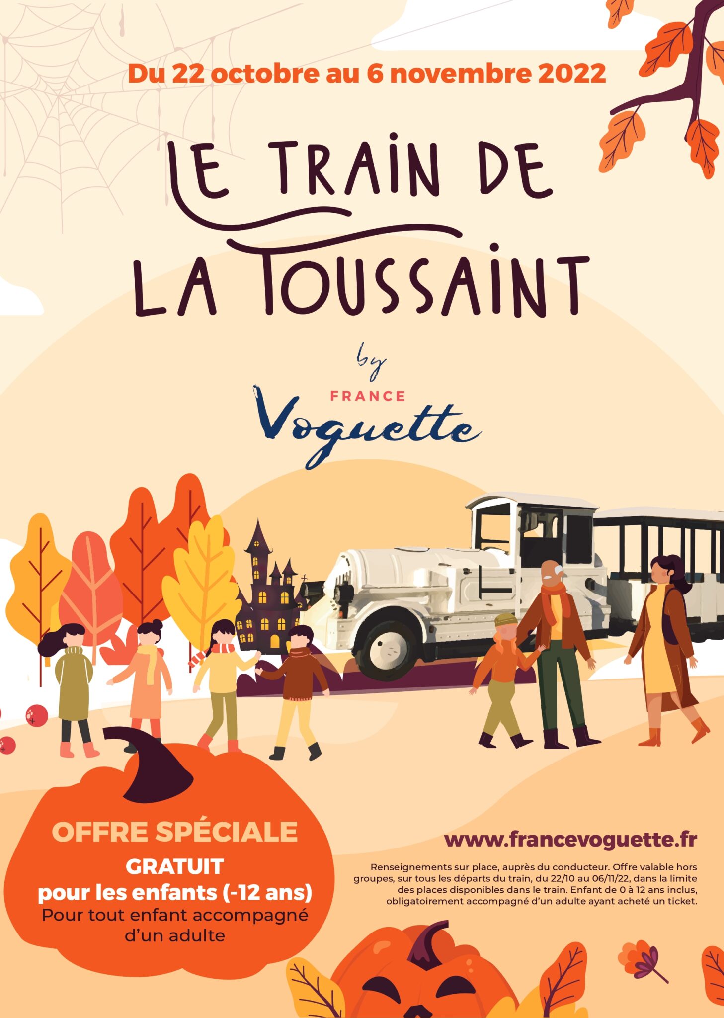 Offre valable hors groupes sur tous les départs du train, du samedi 22 octobre au dimanche 6 novembre 2022. Dans la limite des places disponibles dans le train.