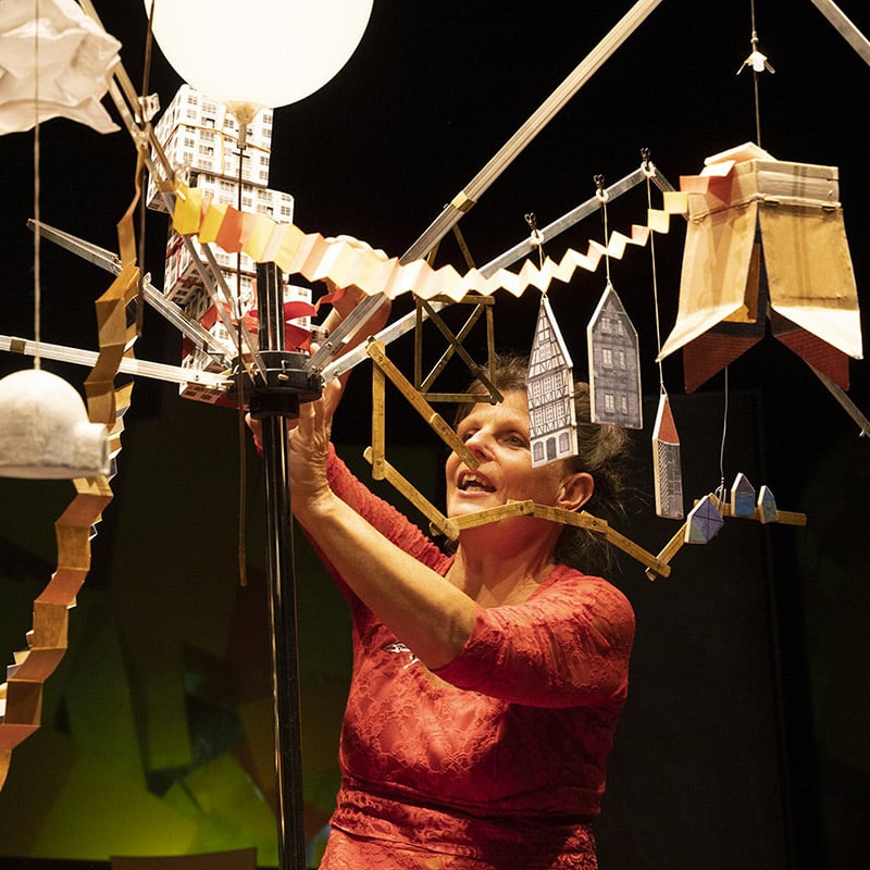 Dans un dispositif circulaire, public et comédien·nes se retrouvent pour vivre cette aventure spécialement écrite et pensée pour les tout-petits. Fait d’un doux mélange de poésie et d’humour, d’objets, de projections et de musique, ce spectacle est une invitation à vivre la création d’un paysage où escaliers et maisons s’entremêlent, où trois chemins se dessinent.