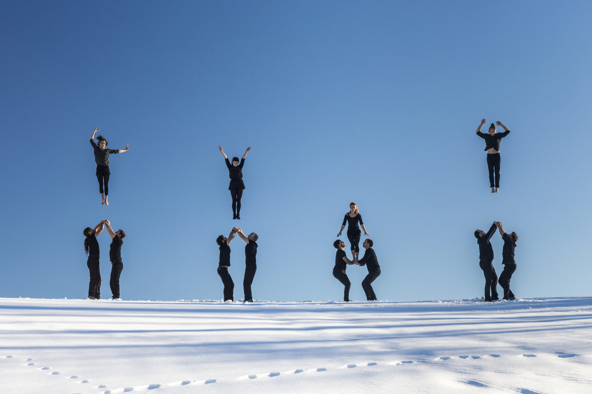 Dix-neuf acrobates de la Compagnie XY, tel un essaim d’oiseaux, explorent les confins de l’acte acrobatique et s’inspirent de phénomènes naturels tels que les murmurations. Ce mode de communication qu’on retrouve de manière évidente dans les vols d’étourneaux : un ballet de centaines d’oiseaux si bien réglé et si dense qu’il en éclipse le soleil l’espace d’un instant…
