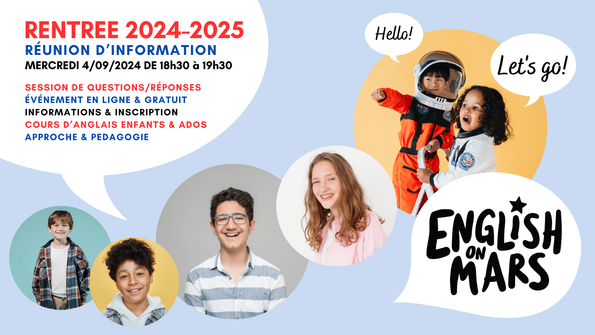 Pour la rentrée 2024-2025, English on Mars propose une réunion d’information pour tous les parents qui souhaitent avoir plus de renseignements sur nos cours d’anglais destinés aux adolescents de 4 à 17 ans (de la moyenne section de maternelle à la terminale).