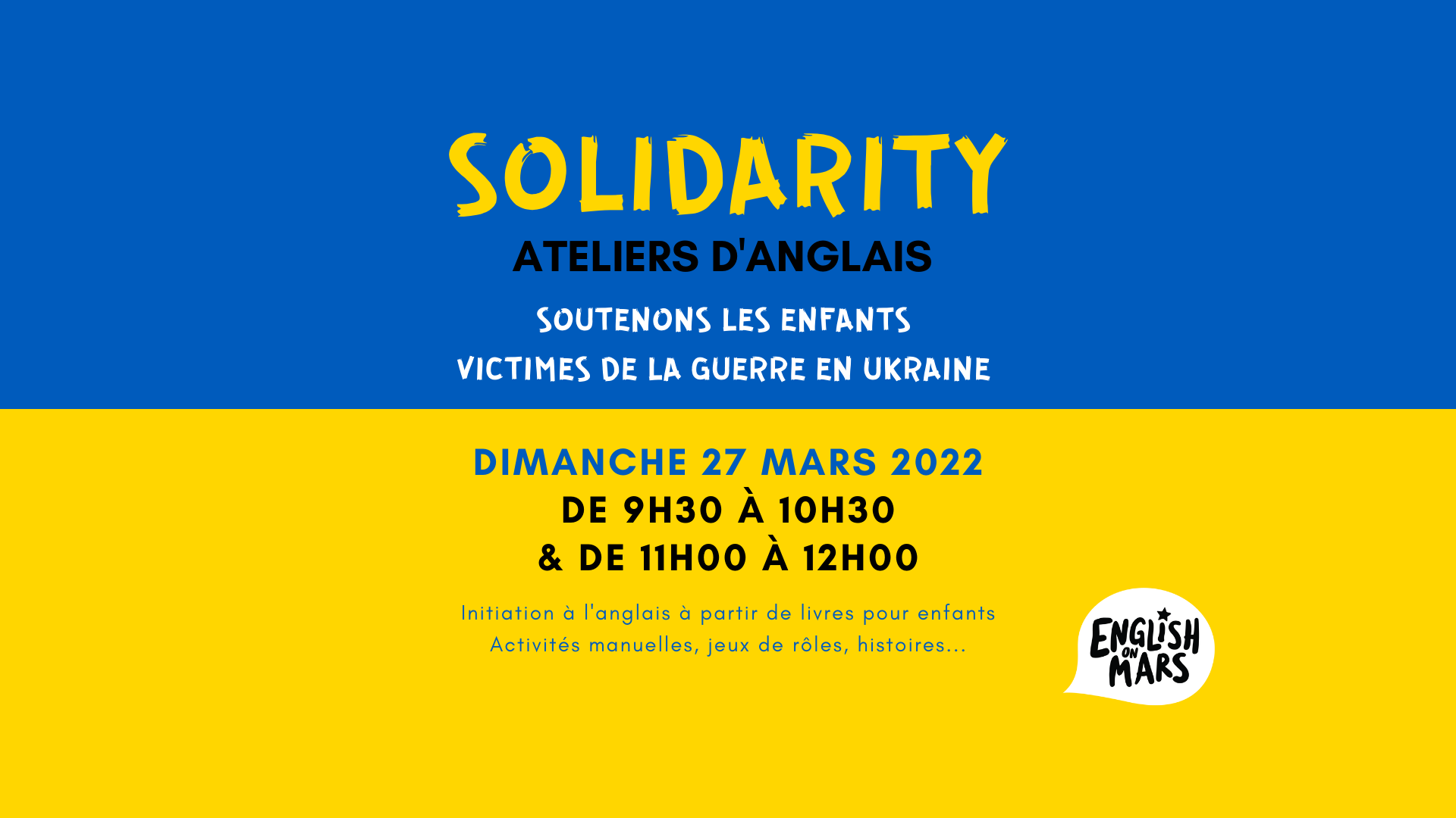 Suite aux événements liés au conflit qui sévit actuellement en Ukraine, English on Mars souhaite apporter son soutien aux enfants victimes de la guerre. Nous avons décidé de proposer des ateliers d’anglais le dimanche 27 mars 2022 afin de récolter des fonds pour soutenir les enfants qui ont besoin d’aide humanitaire. Ces ateliers sont une belle occasion pour les enfants d’apprendre un peu d’anglais et l’opportunité pour les adultes de soutenir une bonne cause !