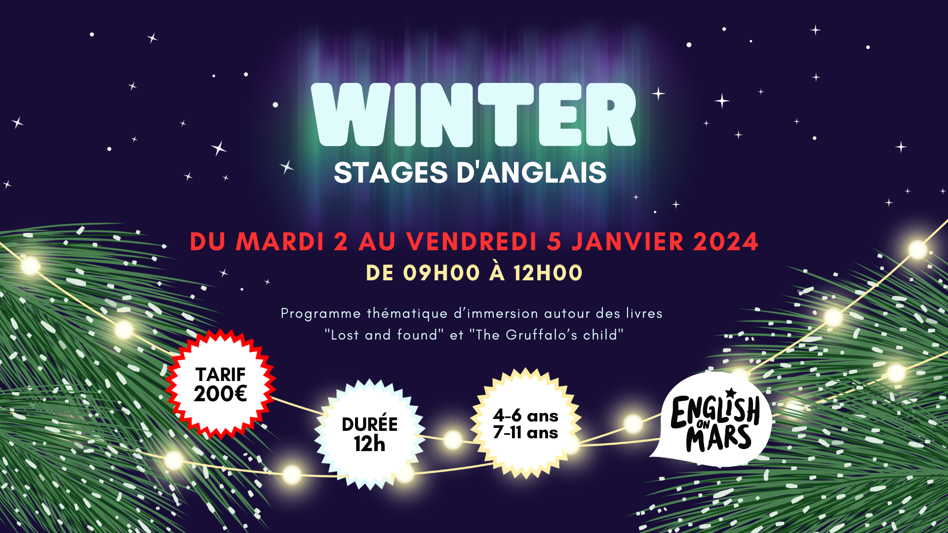 NOUVEAU ! Pendant les vacances de Noël, English on Mars propose des stages d’anglais à destination des enfants de la maternelle au primaire (4-6 ans et 7-11 ans). Ces stages offrent aux enfants la possibilité de développer leurs capacités à communiquer en anglais autour de livres basés sur le thème de l’hiver : « Lost and found » et « The Gruffalo’s child ».