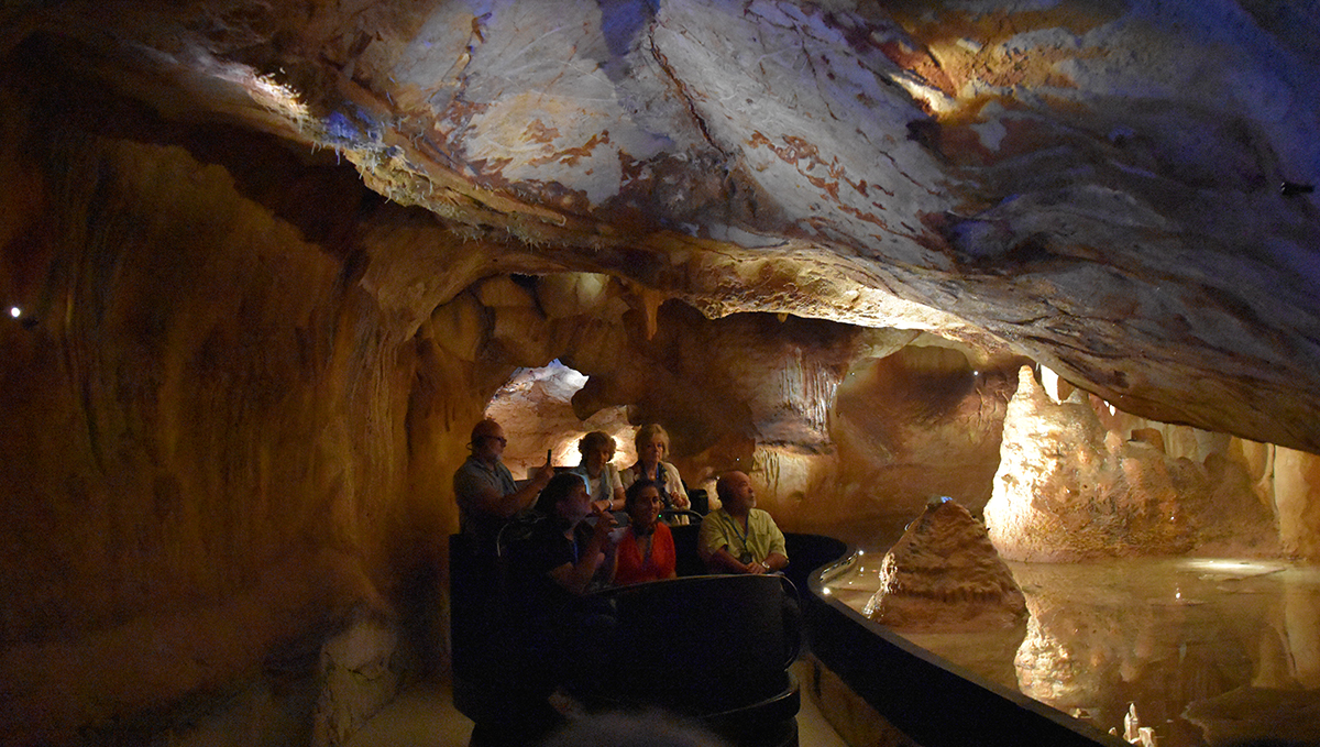 Lors de ce voyage de 35 minutes, les visiteurs découvrent les panneaux ornés qui s’éclairent à leur approche. Le circuit permet de voir toutes les entités d’art pariétal et d’en comprendre l’intérêt avec l’illusion d’être dans la vraie Grotte y compris par la présence de plans d’eau.